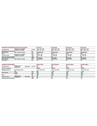 Incorpora de serie una bomba de drenaje que eleva el agua hasta 500 mm. por encima de la bandeja de la unidad. Presenta la máxima eficiencia energética estacional, ya que las unidades exteriores están optimizadas para ofrcer un mejor rendimiento estacional (SEER/SCOP).