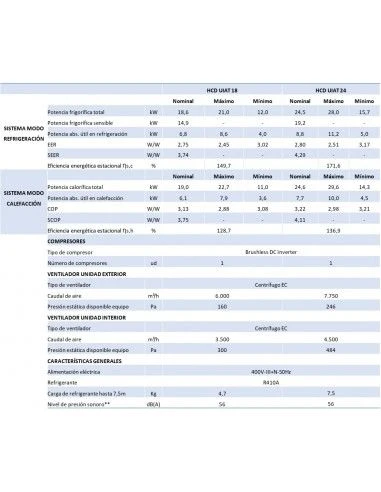 Aire Acondicionado Conducto Daitsu HCD 24 UiAT, con una potencia térmica de 24.5 kW, 21070 frigorías, EER 2.80, COP 3.22, compacto de reducidas dimensiones y con compresor Scroll