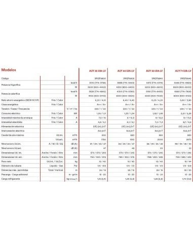 Gama de conjuntos de Aire Acondicionado Cassette Fijitsu AUY UIA-LV, de tensión monofásica y con potencias desde 3.5 a 6.8 kW, esta compuesto por la Unidad interior , la Unidad exterior y Mando por cable táctil. Este modelo de la serie LV, posee nueva aleta laminar.