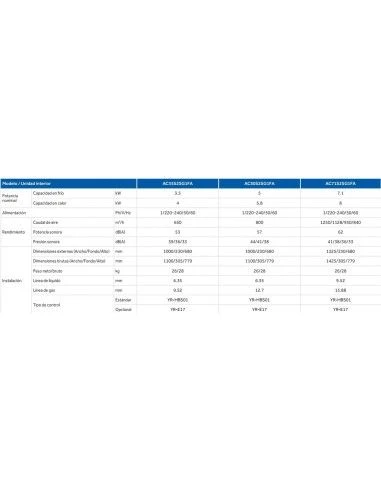 Las unidades interiores se combinan con las unidades exteriores de acuerdo a sus potencias. Consulte la tabla para elegir las opciones que correspondan a su necesidad de climatización.