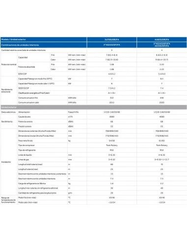 Las unidades interiores se combinan con las unidades exteriores de acuerdo a sus potencias. Consulte la tabla para elegir las opciones que correspondan a su necesidad de climatización.