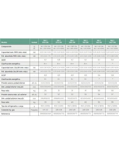 Este equipo ofrece la máxima eficiencia energética, alcanzando hasta la categoría A++, y cuenta con un sistema de purificación de aire y filtrado de partículas para un aire más limpio. La gestión optimizada de arranque y el mínimo nivel sonoro completan las características de este avanzado aire acondicionado, proporcionando un equilibrio perfecto entre rendimiento, eficiencia y comodidad. El conjunto está conformado por una unidad interior VAI 1-050 DNI y una unidad exterior VAI 1-050 KDNO.