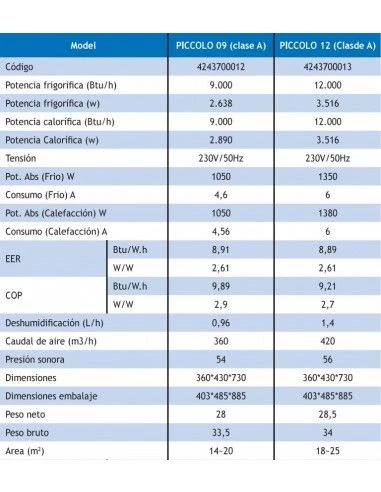 Características técnicas del Aire acondicionado portátil BRITEC Piccolo 12