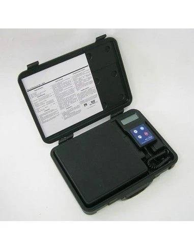 Báscula de carga/recuperación de refrigerante de alta capacidad (100 Kg), calibrada según los estándares estrictos. Tiene una plataforma adjunta extraíble de metal que permite su utilización tanto dentro como fuera de la funda protectora. Amplia pantalla LCD, con gran visibilidad, resolución de 22,5 x 68 mm. Escala de medidas Imperial o Métrica, en incrementos de 0,25 oz/10 g. Medidor portátil ergonómico con cable bobinado. Protección de sobrecarga completamente mecanizada y visual