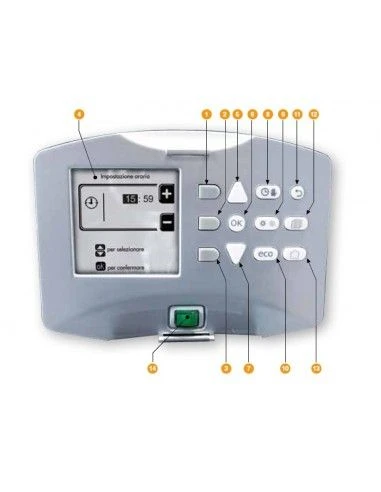 Caracterizado por una gran pantalla de matriz de puntos y teclas para configurar las funciones básicas del generador y para seleccionar los menus de parametrización.