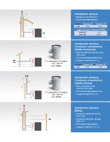 Al tratarse de calderas de condensación, es posible implementar tuberías, conductos o materiales de plástico como (Polipropileno), ya que los humos nunca superarán los 120°C, que es la temperatura máx. de la chimenea. En la caldera Climadens, la temperatura media de humos es de 75°C aprox.