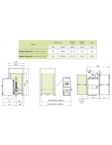 La Gama BIOMAX COMPACT de la Marca Lasian es una caldera con cuerpo de hierro fundido por elementos, que favorece una vida más larga, al reducir considerablemente los daños derivados de la condensación, son de máxima eficiencia y mínimas emisiones. Con encendido automático del quemador, modelo Biomax, para combustibles sólidos como pellets, cáscara de almendra, orujillo, hueso de oliva, etc. La carga del combustible la realiza en función de la demanda. Disponble en disitintas potencias de 30 y 45 kW.