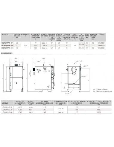 La gama de calderas de leña LIGNUM cuenta con 3 modelos con potencias térmicas de 20 kW, 30 kW y 40 kW. Es una caldera de gasificación de tiro invertido basada en la combustión del gas generado por la leña. Tiene dos cámaras divididas por una boquilla de material refractario. En la parte superior de la Caldera de leña LIGNUM NG se encuentra la cámara de carga también llamada de gasificación, por donde se produce liberación de los gases de la madera. El gas que se genera por este principio se mezcla con el aire secundario precalentado en la pieza de refractario llamada boquilla y es dirigida a la cámara de combustión por efecto del ventilador.