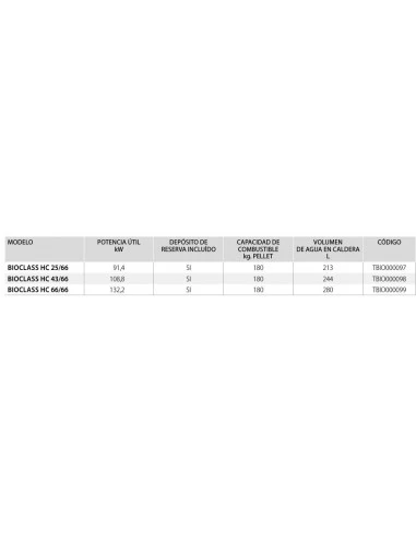 La gama de calderas de biomasa Domusa BioClass HC está diseñada para instalaciones con potencias entre 91kW y 132kW y que utilicen pellet de pino como combustible, se presenta esta caldera modular para funcionamiento en cascada. Incluye el depósito de reserva, el cenicero compresor y un sistema de aspiración para el transporte de pellet