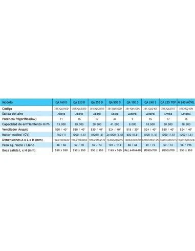 El Climatizador evaporativo industrial Tecna COOLBREEZE QA 500 D, con caudal de 41.000 m3/h, de tensión monofásica, 3 velocidades y capacidad de saturación de 98 %.