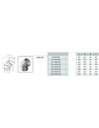 Codo 45° de acero inoxidable 316 Fig Ø 100, para calderas simples, colectivas, vertical, instalación exterior
