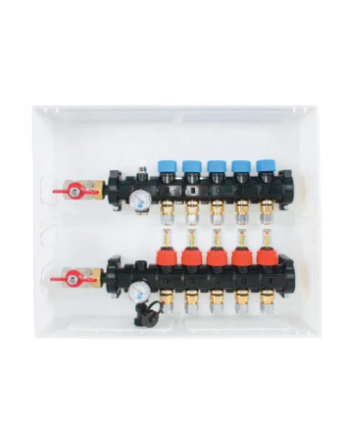 Esta compuesto por un colector de ida con caudalímetros para la regulación y equilibrado de circuitos, y un colector de retorno con llaves de corte de esfera metálicas para los ataques al colector.
