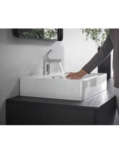 El Grifo para lavabo Hansgrohe Logis 100 vaciador automático tiene un diseño moderno con curvaturas en el mando y la base, encaja perfectamente en los baños modernos. Su acabado cromo brillante se puede limpiar con mucha facilidad. Una de las principales ventajas de este grifo de lavabo es que cuenta con un limitador de caudal, con un máximo de 5 l/min, permite ahorrar agua y cuidar el ambiente.