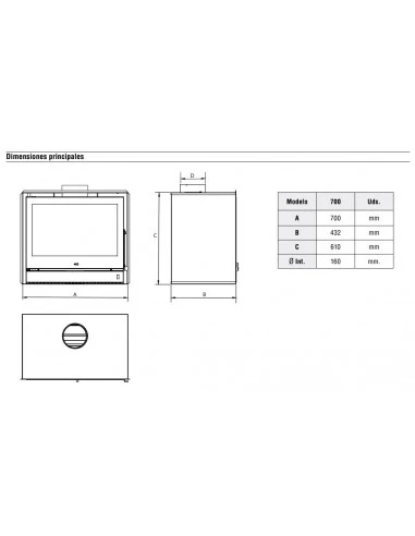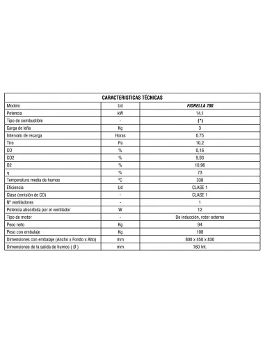 | El insertable Fiorella 700, con una potencia térmica de 14.0 kW capaz de calefactar estancias de hasta 100 m2, esta diseñado para calentar estancias, por radiación y convección, utilizando como combustible leña seca. Se trata de una estufa encastrable en una pared y con una puerta fácilmente aperturable, con vidrio térmico que favorece la trasmisión del calor por radiación. El aparato incorpora un ventilador para favorecer el calentamiento del local por convección, la puerta fabricada en acero y pintada con esmalte silicólico a base de resinas anticalóricas de silicona pura, resistente a altas temperaturas en uso continuo, resiste hasta 600ºC. El vidrio es de material resistente a altas temperaturas, llegando a soportar los 800ºC. El cristal está protegido en su unión con el marco de la puerta por una junta plana adhesiva. Es conveniente cambiar al junta una o dos veces al año en función del uso que se de al insertable. Gracias a su cámara de convección (insertable) es posible un mayor aprovechamiento de la potencia calorífica de la madera (calor por radiación y convección) |