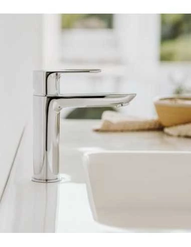 Mezclador monomando para lavabo con cuerpo liso y enlaces de alimentación flexibles. No incluye desagüe click-clack. Apertura en agua fría