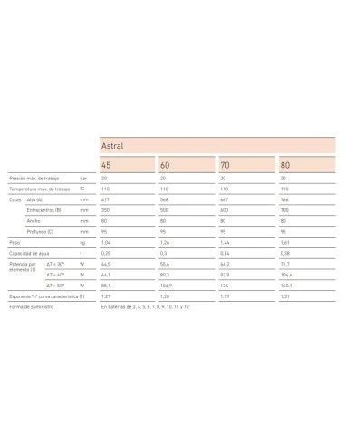 El diseño del radiador Baxi ASTRAL 80 da prestigio por la elegancia, valor y calidad de su diseño de frontal plano, que se adapta a los gustos más modernos y a las necesidades de diseño de interiores, manteniéndose a la vanguardia de la manera más discreta. Este Radiador de aluminio Baxi Astral 80 de 4 elementos es de fácil mantenimiento, gracias a la simplicidad en el diseño de sus laterales y el frontal plano, facilitan al máximo la limpieza de posibles residuos de polvo. Disponible en 4 modelos de 45, 60, 70 y 80 y suministrado en baterías de 3 a 12 elementos.