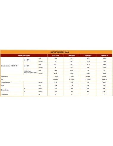 - Emisión térmica UNE EN 442 ΔT = 50 ºC: 142,2 W – 122,3 kcal/h
