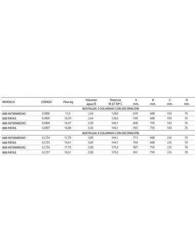 Los radiadores NOSTALGIA son equipos adaptables a cualquier espacio con A 695 x B 600 x C 183 x D 76 mm.