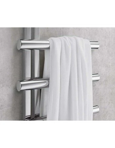 Runtal Chime, de formas redondeadas y de acero inoxidable pulido de gran calidad, se puede instalar tanto a la izquierda como a la derecha. Los tubos cilíndricos hacen que las toallas se coloquen y deslicen con suavidad y sin esfuerzo con una sola mano. Su forma ergonómica permite una limpieza fácil y rápida, lo que garantiza la máxima higiene.