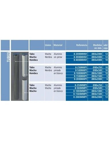 Tubo de alummio, diámetro 80, unión Macho/Hembra, pintado blanco para aparatos tradicionales, cámara estanca, instalación individual en interiores, largo 2000 mm