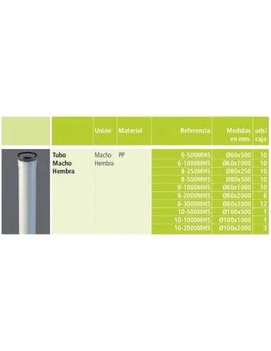 Tubo de polipropileno extrusionado Fig 8-3000MH5, diámetro 80, largo 3000 mm, unión Macho/Hembra, blanco, aparatos de condensación, instalación individual y colectivas en interior